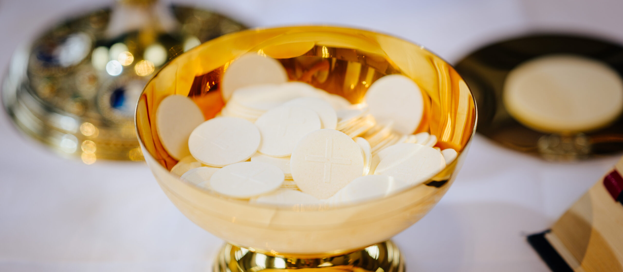 Bei jeder Kommunion, auch Eucharistie genannt, erinnern die Gläubigen sich an das letzte Abendmahl, das Jesu mit seinen Freunden gefeiert hat sowie an seinen Tod und die Auferstehung. Für uns ist das Sakrament der Eucharistie jedoch mehr als ein Erinnerungsakt. Wir glauben daran, dass Jesus in Brot und Wein tatsächlich gegenwärtig ist. Wenn Gläubige das Brot zur Kommunion empfangen, empfangen sie Jesus selbst. Auf diese Weise sollen die Gläubigen immer wieder mit Christus vereint werden, Kraft schöpfen und von innen verwandelt werden, um Jesu in Wort und Tat nachzufolgen.