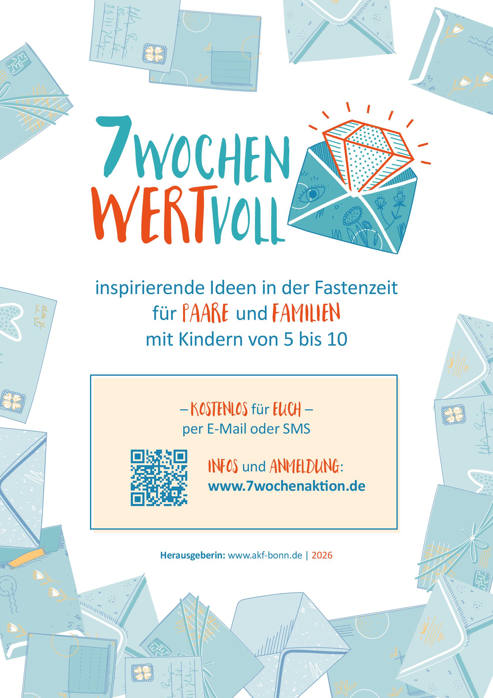 Die Aktion richtet sich an Paare jeden Alters sowie an Familien mit Kindern im Grundschulalter. Anmelden können Sie sich über die Homepage 7Wochenaktion.de oder über den beigefügten QR-Code. Nach der Anmeldung erhalten die Teilnehmenden sieben Wochen lang wöchentlich eine E-Mail oder SMS mit Inspirationen für Alltag, Partnerschaft und Familienleben, Ideen für gemeinsame Aktionen und Anregungen für Gespräche. So kann die Fastenzeit zu einer wertvollen Zeit der Begegnung und der der Wertschätzung werden: für Paare, Familien und alle, die sich gemeinsam auf den Weg machen möchten.